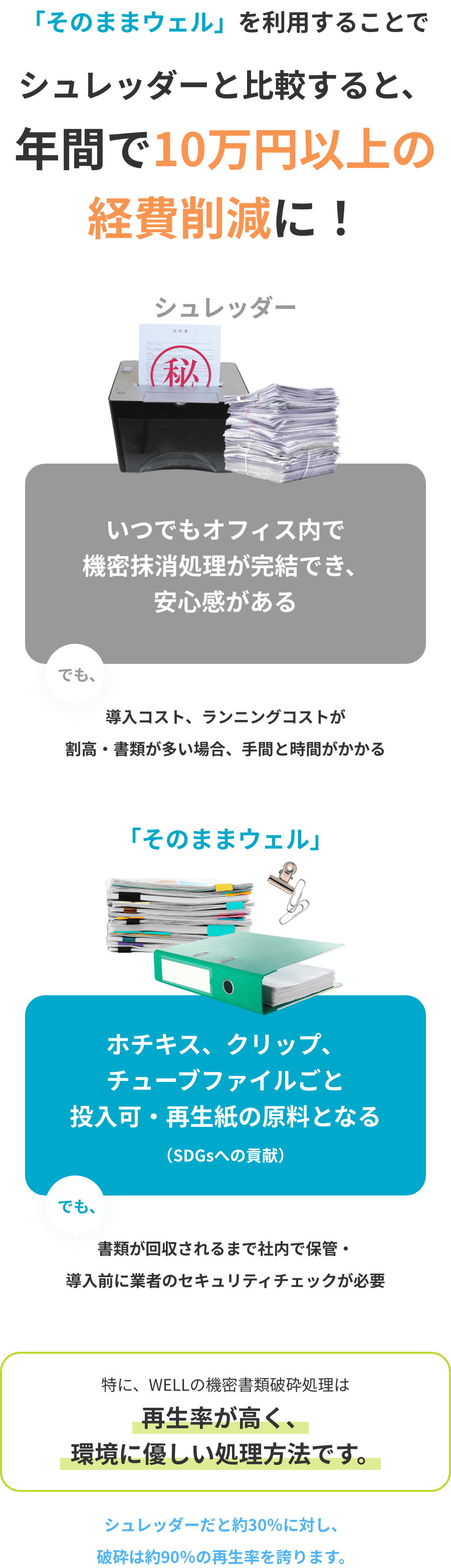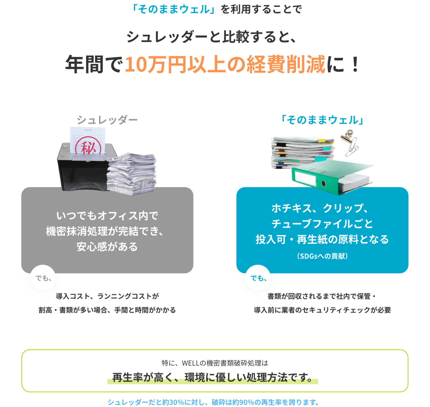 シュレッダーの場合上記に加えて、ゴミ袋の交換や清掃、ファイルからの分別の手間がかかるので、更に見えない人件費がかかります。