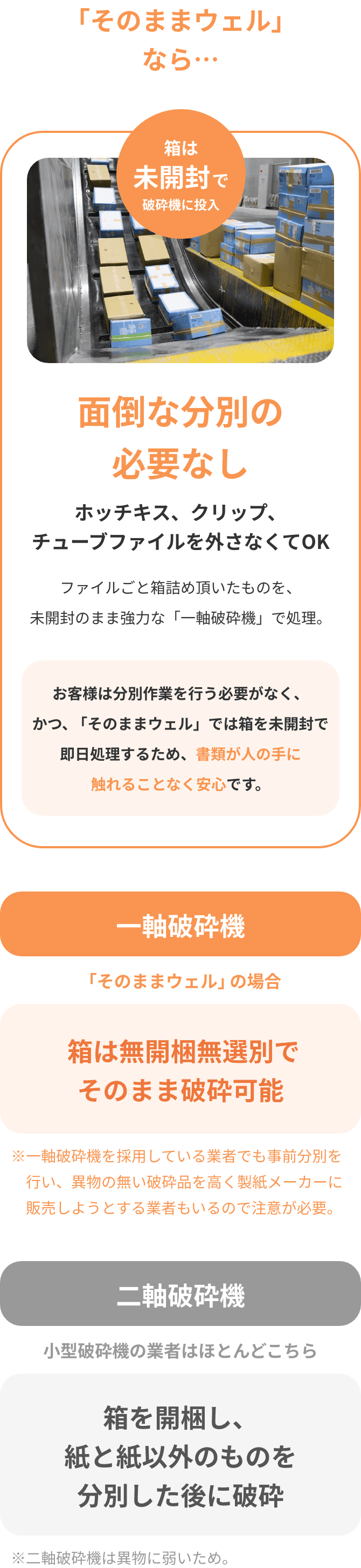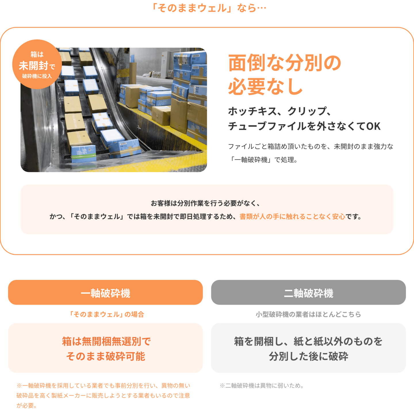 処理能力(100㎏の裁断時間):シュレッダーA 120分、シュレッダーB 90分、セキュリティボックス 投入口から投入するだけ